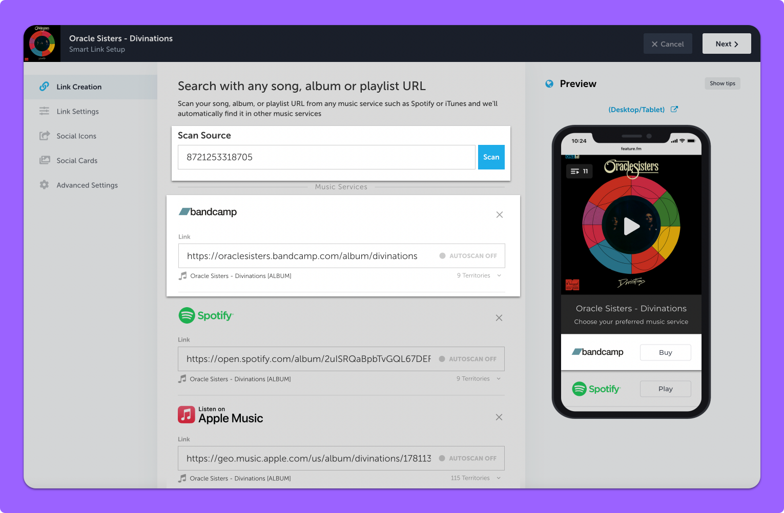When creating a new Smart Link or Pre-Save campaign, artists enter a scan source, such as a UPC or ISRC. Feature.fm then uses this information to automatically find the artist’s music on Bandcamp and include the appropriate links on their landing pages. This streamlined solution ensures that fans have immediate access to purchase or stream music through Bandcamp, creating a seamless and intuitive user journey.