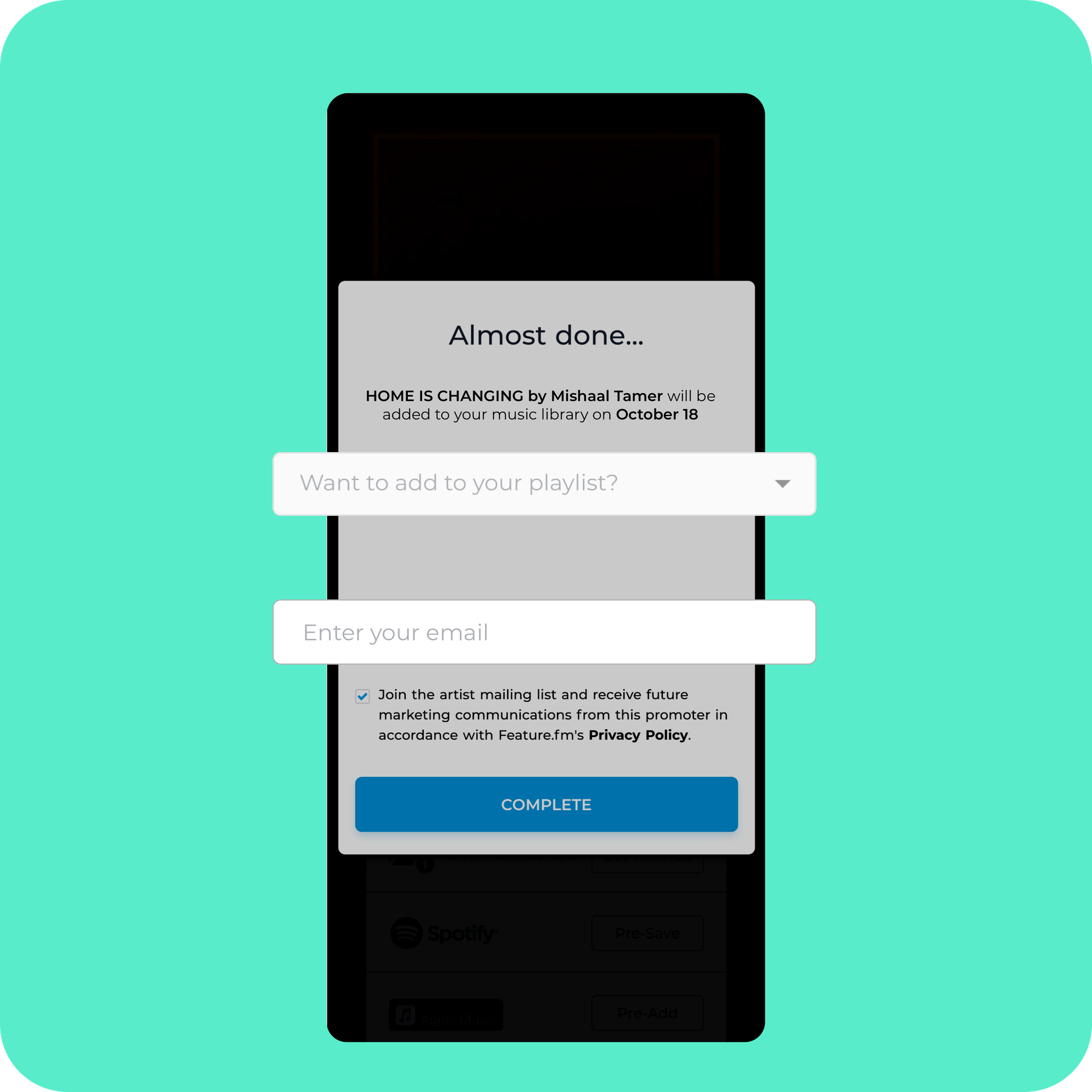 Be where your fans are, get added to their playlists and collect emails